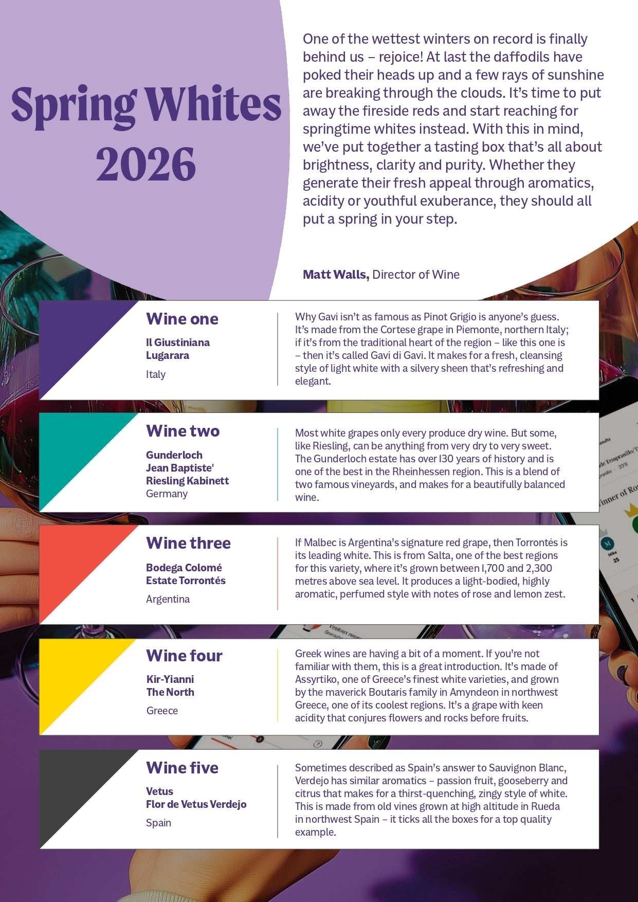 One of the wettest winters on record is finally behind us – rejoice! At last the daffodils have poked their heads up and a few rays of sunshine are breaking through the clouds. It’s time to put away the fireside reds and start reaching for springtime whites instead. With this in mind, we’ve put together a tasting box that’s all about brightness, clarity and purity. Whether they generate their fresh appeal through aromatics, acidity or youthful exuberance, they should all put a spring in your step.